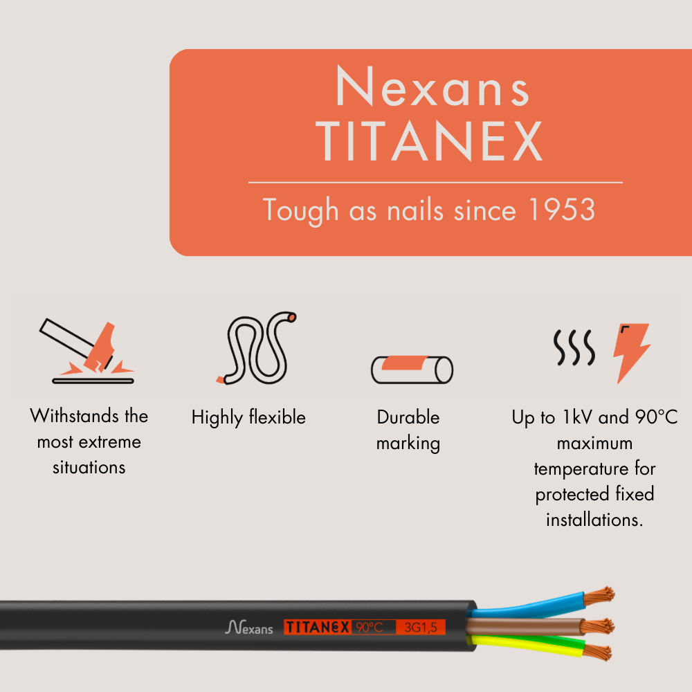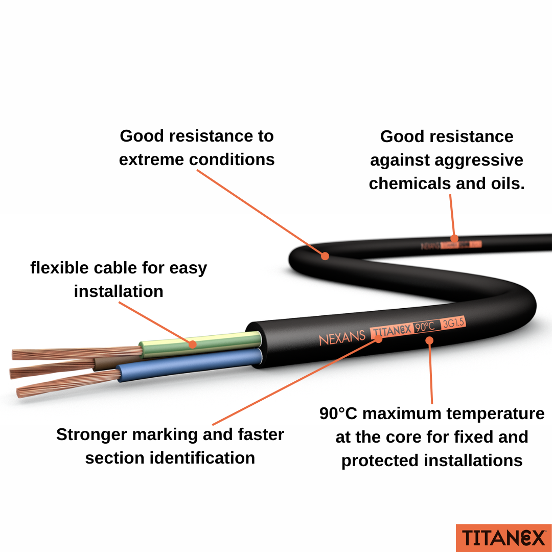 TITANEX, the Nexans H07RN-F is a flexible cable, elastomer insulated and sheathed cable with a copper core.